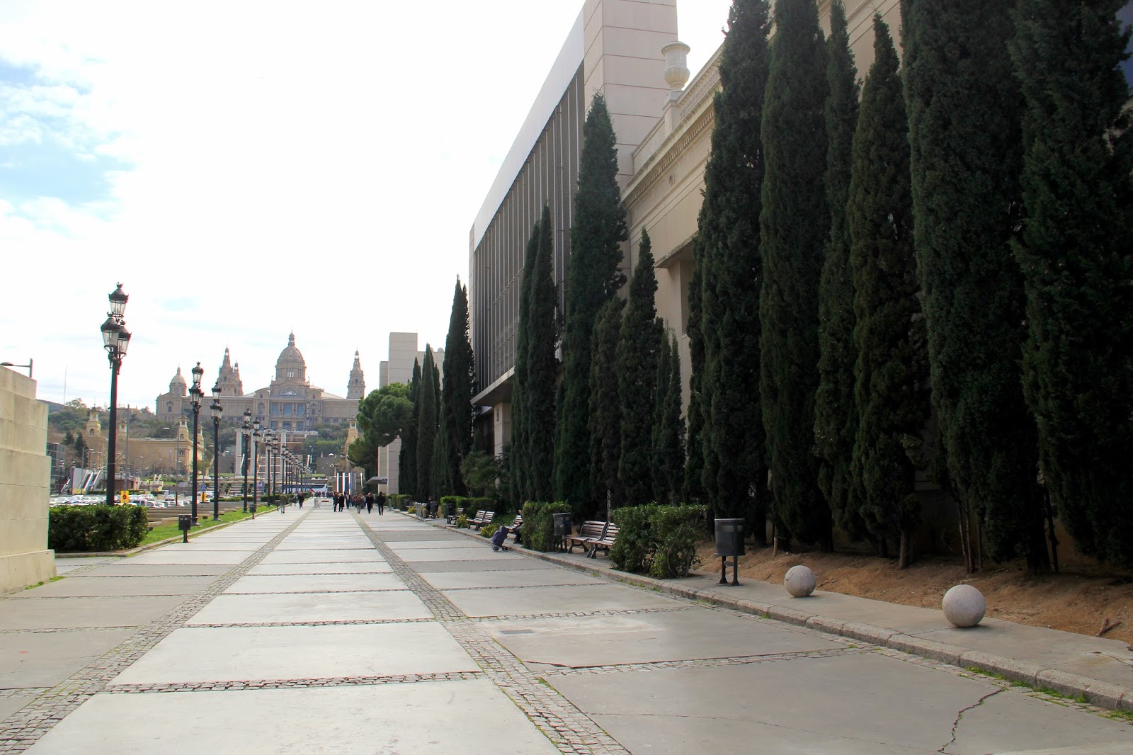 If you arrive by bus, you will stop in this location. You will see this scene to your right and the National Art Museum of Catalonia.